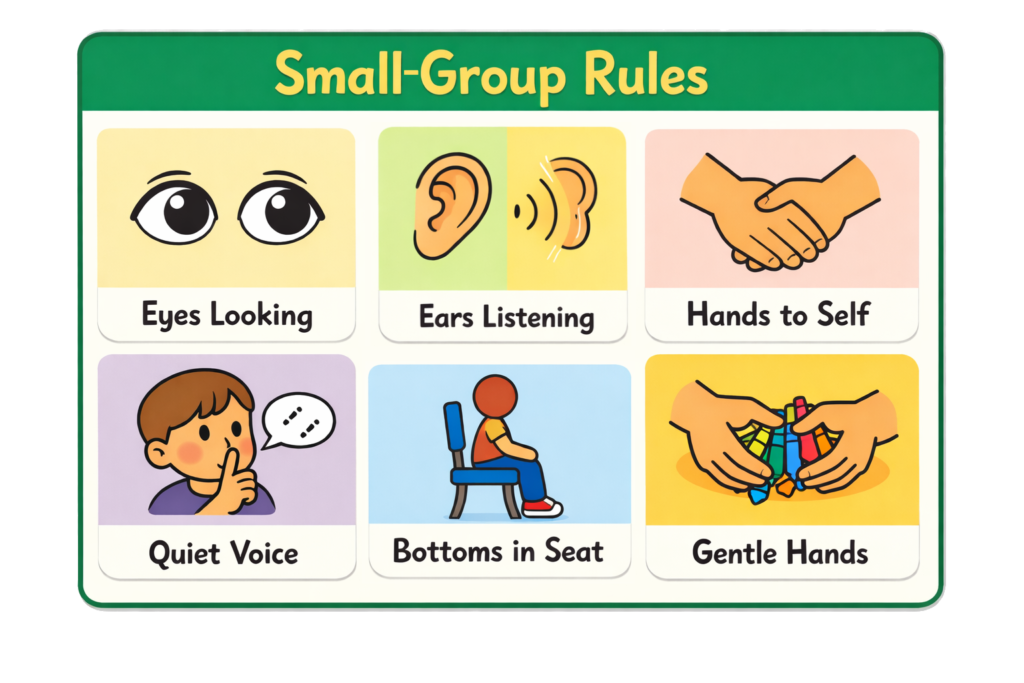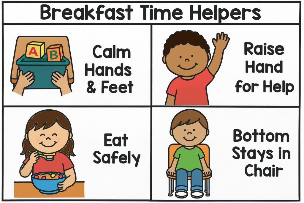 Below is an example of three co-regulation cards: one for breakfast time, one that applies to any situation, and one for small-group participation. (Download a printable collection here.)